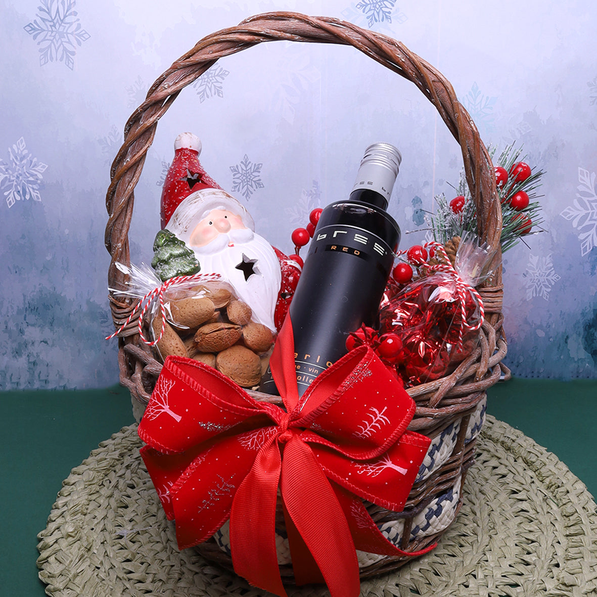 A beautiful basket with one bottle of wine, nuts, chocolate and ornament.