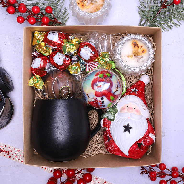 A beautiful box with mug, muffin, chocolate bomb, chocolates, candle and ornament.